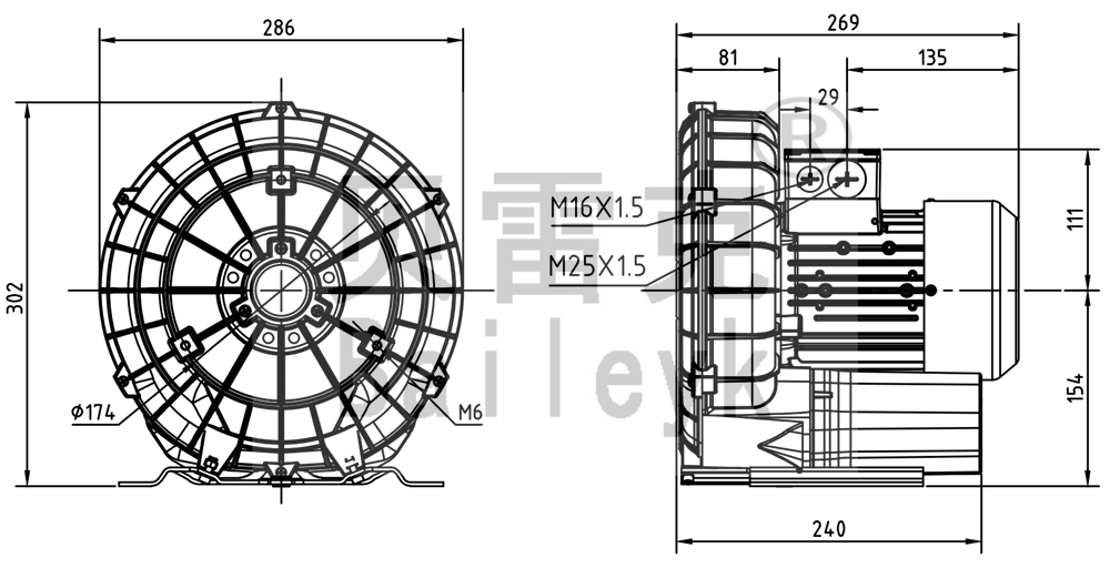 最大風(fēng)量:145m3/h 最大正壓:120mbar 最大負(fù)壓:120mbar 防護等級:IP55 噪音:63db 重量:15Kg