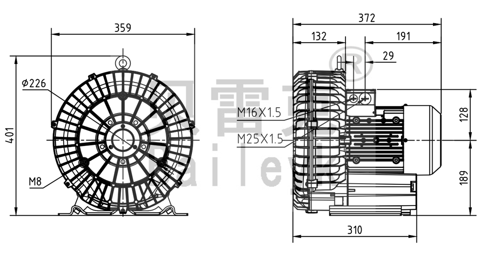 最大風(fēng)量:345m3/h 最大正壓:125mbar 最大負(fù)壓:125mbar 防護(hù)等級(jí):IP55 噪音:70db 重量:26Kg